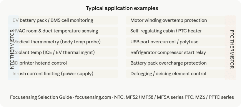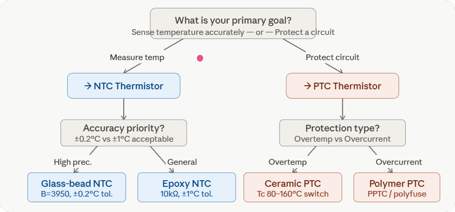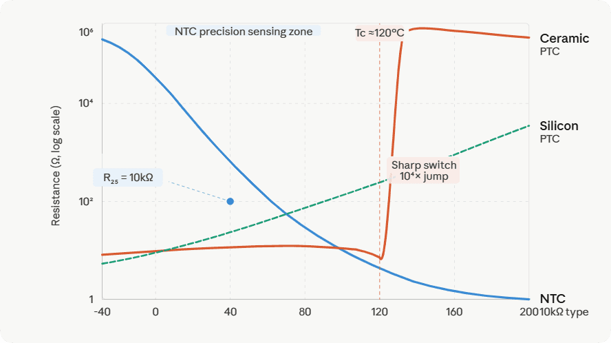NTC thermistors (Negative Temperature Coefficient) are the correct choice when your goal is to measure temperature with precision — their resistance decreases predictably as temperature rises, enabling ±0.2°C accuracy in BMS, HVAC, medical, and IoT sensing applications. PTC thermistors (Positive Temperature Coefficient) are the correct choice when your goal is to protect a circuit — their resistance spikes sharply at a defined Curie temperature, acting as a self-resetting thermal switch for motor protection, overcurrent limiting, and self-regulating heating. The rule of thumb: if you need to know what the temperature is, use NTC; if you need to stop something from overheating or prevent a current surge, use PTC.